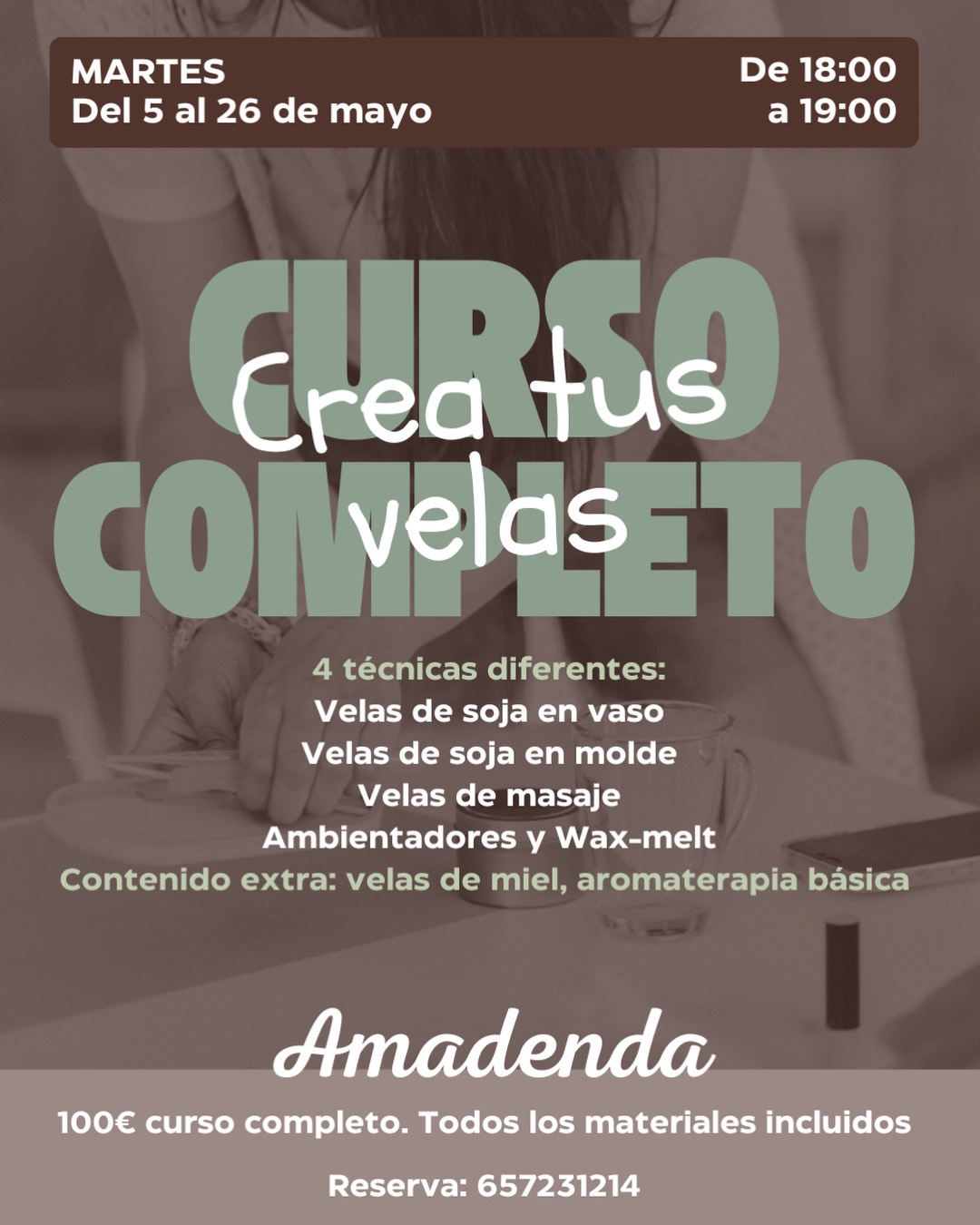 Llega nuestro curso completo de velas creativas, un espacio para aprender, experimentar y crear con tus manos. Durante 4 sesiones descubrirás 4 técnicas diferentes: